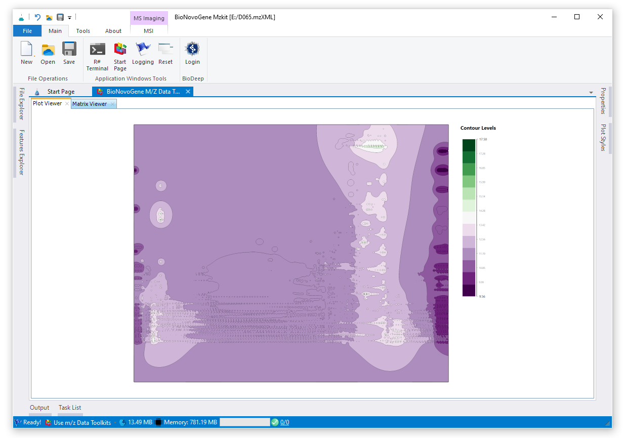 在一级质谱数据之中,一个数据点是由三种维度的值所构成的:m/z,rt,intensity。假若我们将m/z值当作为Y轴,rt值当作为X轴,这个时候我们就可以确定一个坐标点的。再加上对应的intensity响应度值,那么我们就可以通过这三个维度的数据来进行等高线的绘制了。在mzkit程序之中,大家可以通过原始数据文件的概览功能进行一级扫描原始数据的等高线图的查看。