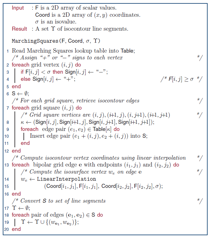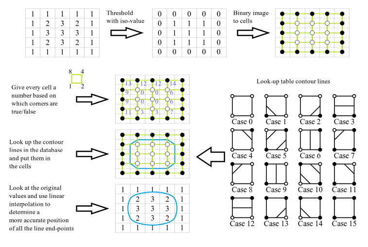 等高线可以通过一种名称为Marching Squares的算法来实现。Marching squares是计算机图形学中一个用于矩阵网格点数据生成等值面的一个算法。在Marching squares算法之中,其主要思想是将每个2*2网格,其中4个顶点网格点根据等值线阈值处理为0,1标量。