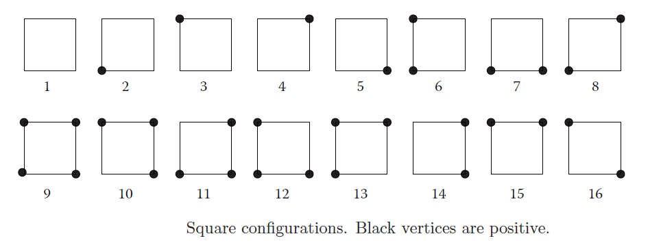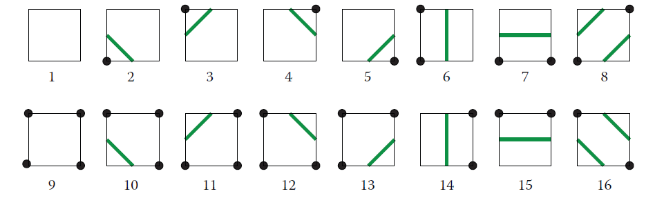 进行完顶点的标记之后,我们最后只需要进行划线,产生一个闭合的多边形,就可以得到某一个高度值对应的等高线多边形了。在我们的网格中相邻的四个顶点就是一个cell,对于每一个cell,根据顶点的标记结果,一共有种情况。2^4 = 16