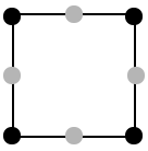在我们所划分的网格中,每一个顶点都有一个插值过后的数值。这些数据值就是高度值,假设我们现在要画一条高度值为某一个threshold的等高线。我们可以把threshold值和网格上面的数值进行比较,大于等于该threshold值的网格顶点记为1,用实心黑点标记;反之,网格顶点为0,不标记。