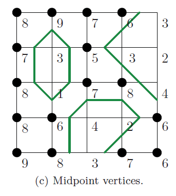 这16种情况对应于轮廓线的绘制也有16种情况。这里在每个cell的每条边都插入了Midpoint。通过连接cell的中点,就可以绘制出轮廓线多边形,这些绘制出来的多边形就是我们的等高线。