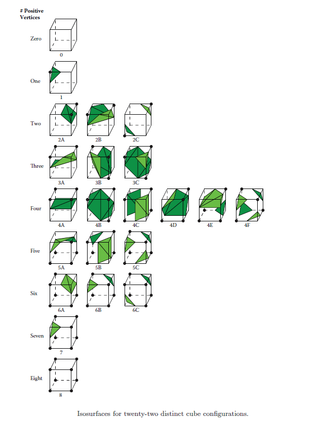 如果我们将Marching Squares算法扩展到三围空间,cell变成了cube。这个时候,对应的算法就是Marching cubes这个名字。Marching cubes算法常用于生成一些医学图像。