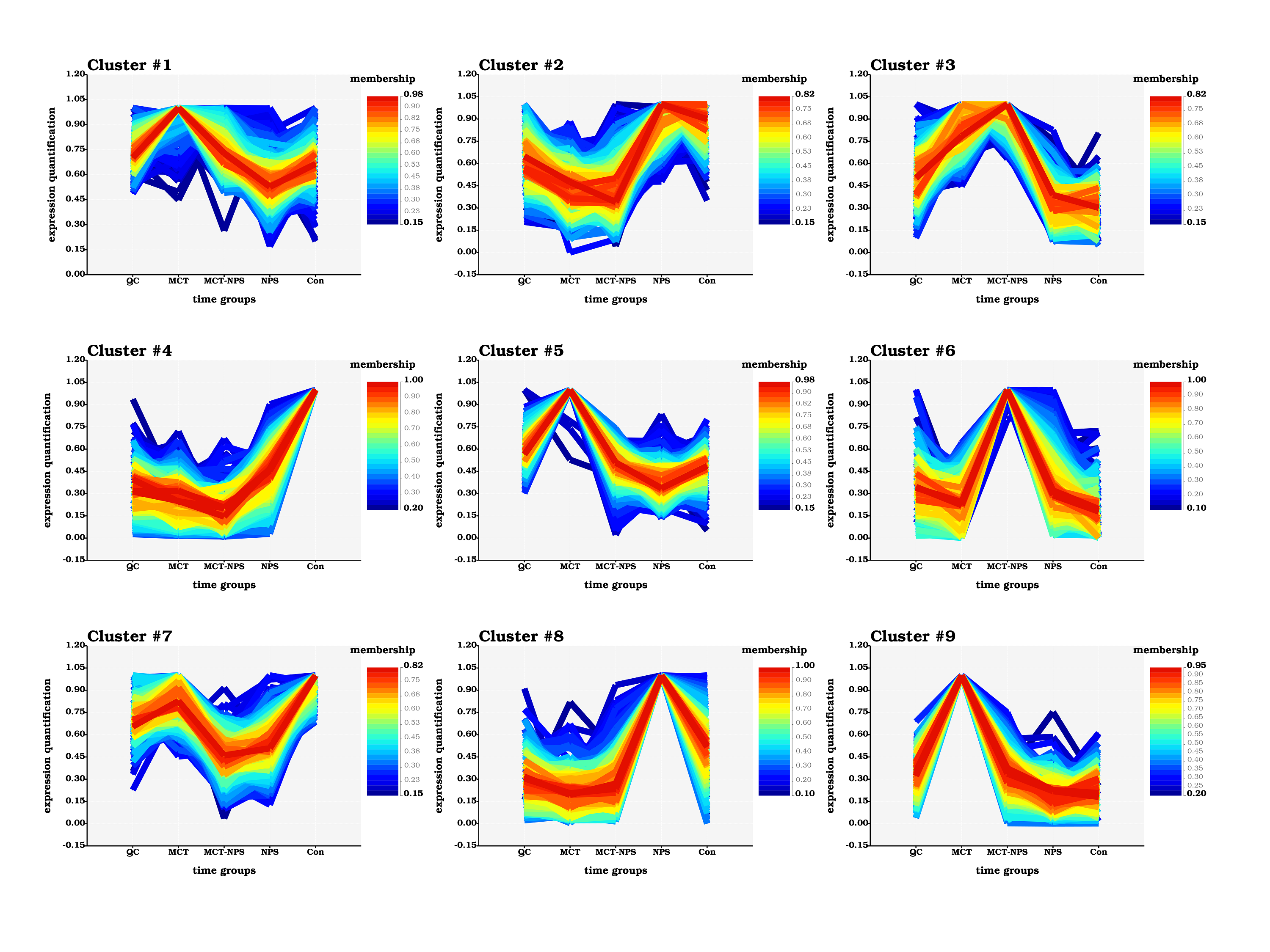 在上面的结果图之中,一个cluster就是对一群表达量变化趋势很相似的基因的集合的在时间上的表达量可视化。上面的可视化图之中,X坐标轴为时间序列或者我们的实验分组,Y坐标轴则是进行数据缩放后得到的相对的表达量值。在每一个图标之中,我们对每一个基因的表达量都绘制了一条曲线,并且用不同的颜色对这个基因与当前的cmeans聚类结果的归属度进行了显示。曲线的颜色偏红色表示基因与当前的聚类的成员归属度越高,反之蓝色表示归属度越低。