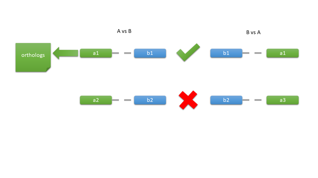 • 接着呢,在B vs A的结果之中查找对应的subject是否是query1。如果这个对应关系存在的话,则说明当前的比对结果是一条最佳双向比对的结果,这两个基因之间很有可能是一个直系同源关系。