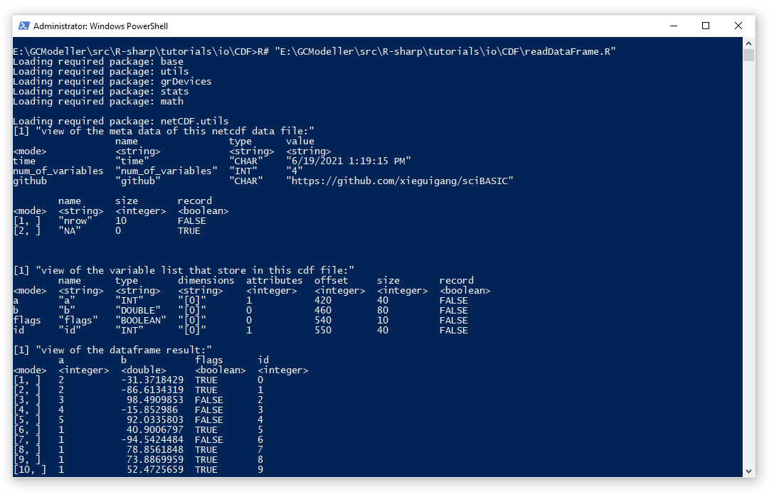 运行一下上面的脚本,可以看到R#脚本已经很清楚地为我们打印出来了我们所需要的一些CDF文件的信息: