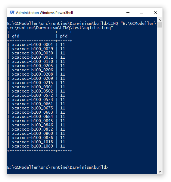 好的,我们将上面的demo查询脚本保存一下,通过LINQ命令执行一下。我们可以看到,LINQ查询解释器已经将所有的pid等于11的结果都筛选出来了: