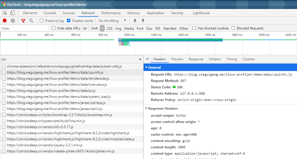 存储服务器的性能快照的JS文件,我都存放在了报告的根文件夹下的data文件夹。如果大家通过谷歌浏览器打开这个小工具所生成的报告html文件,按下F12打开控制台查看网络活动,可以看到加载了这几个js数据文件: