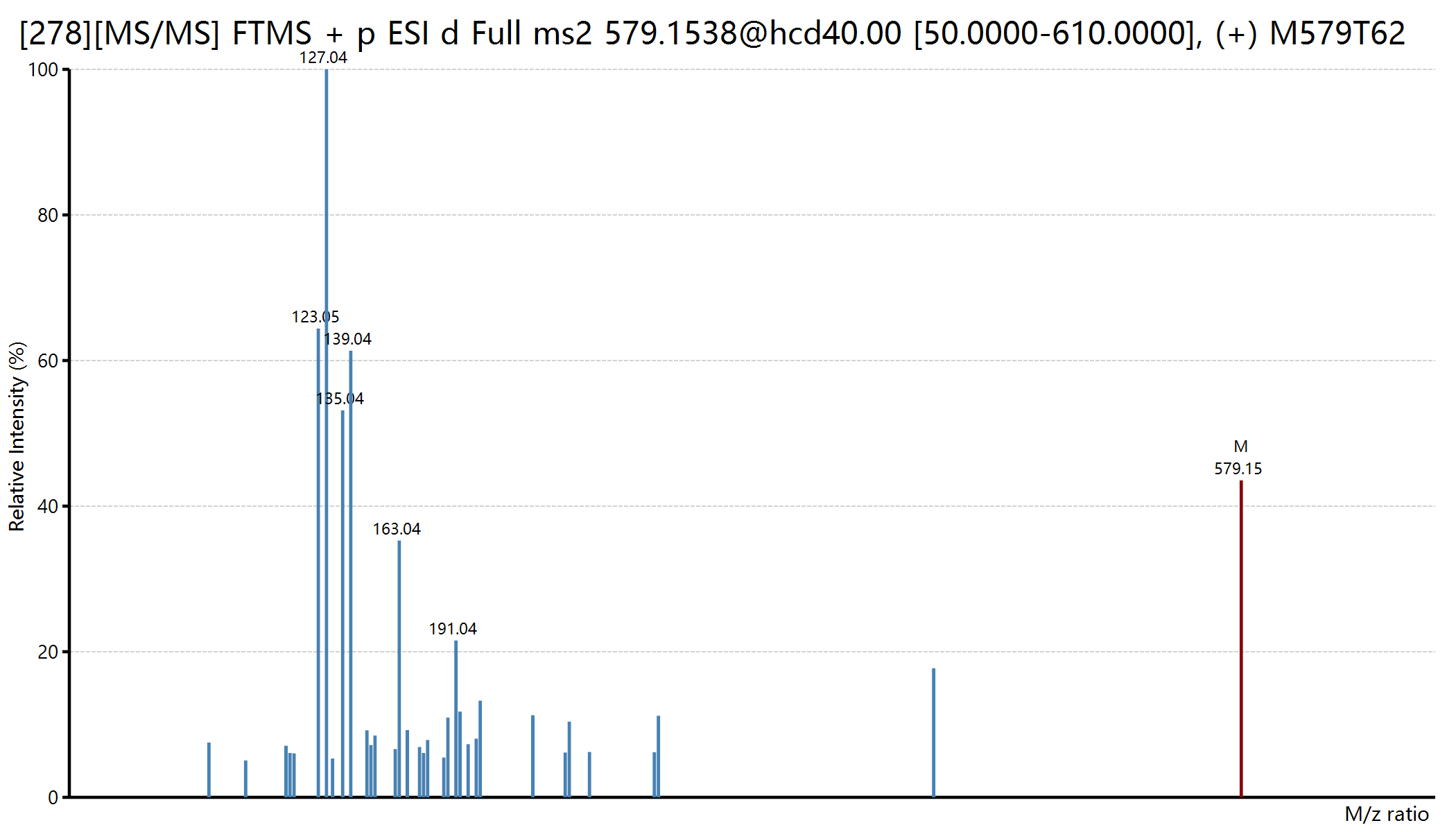 完成视图切换之后,在我们的原始数据之中,所有的具有二级质谱图的离子都显示出来了。接着呢,我们就可以根据目标m/z找出目标离子就可以啦。