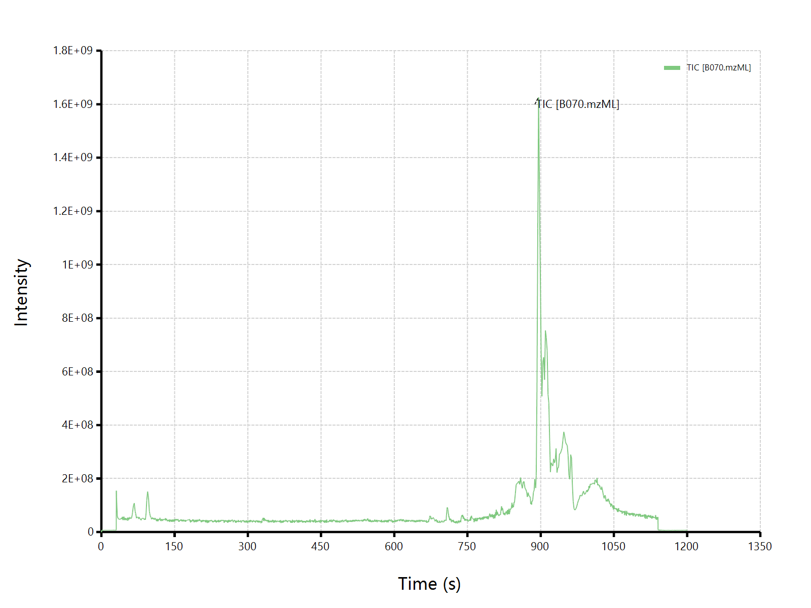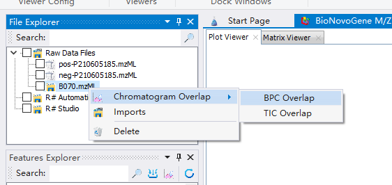嗯嗯嗯,在导入了这个mzML格式的原始数据文件之后,我们在文件浏览器【File Explorer】中,可以看到我们的文件已经出现在文件树里面了。我们可以直接在目标文件上通过右键菜单,查看BPC/TIC色谱图: