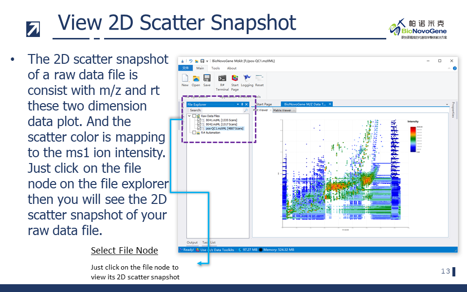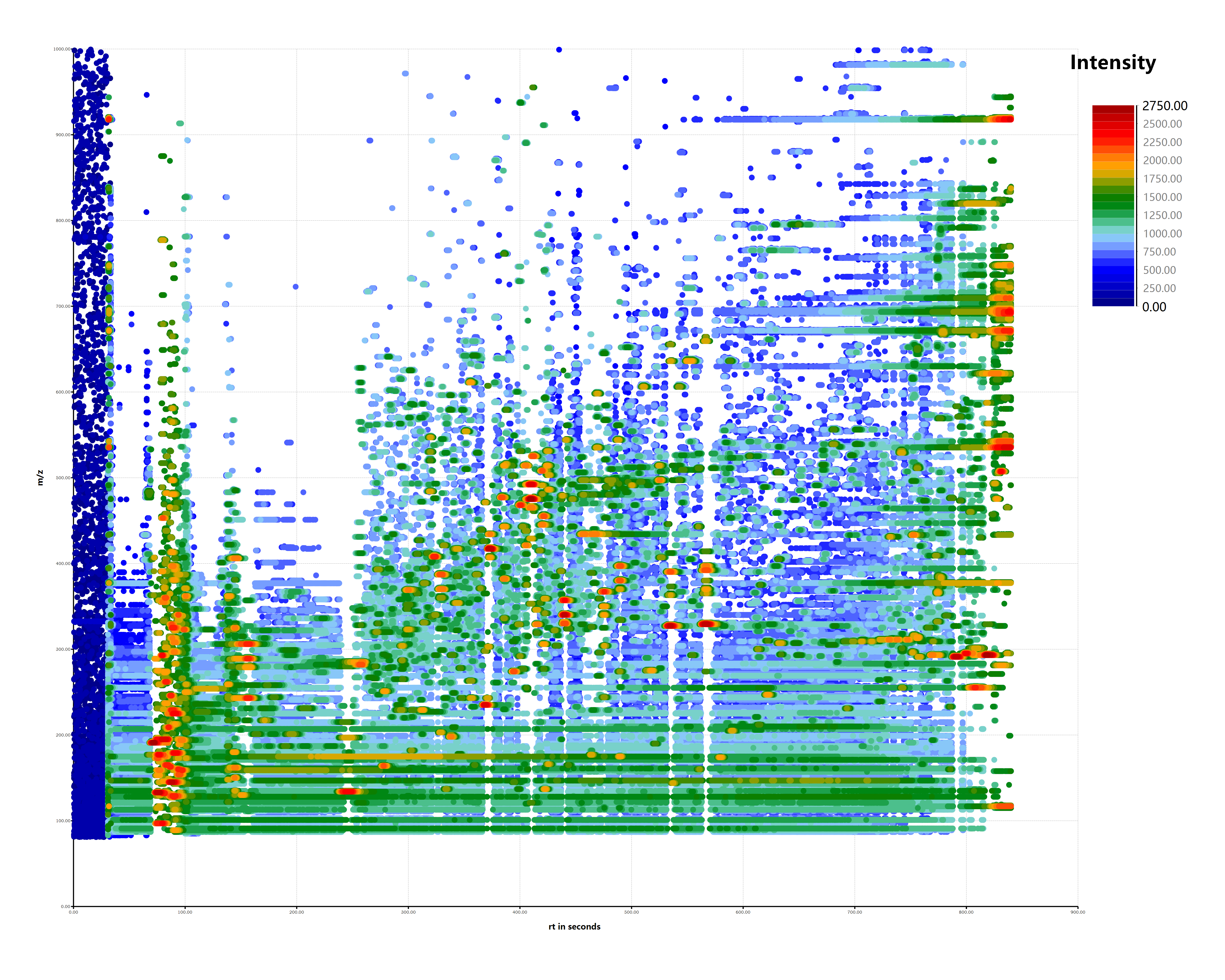 - 【散点图】散点图就是以[scan_time, m/z]为二维坐标点进行散点图的绘制,斑点的颜色则是通过数据点对应的intensity值映射到一个颜色等级上来完成上色的。在散点图之中,一个数据点就是一个一级母离子。