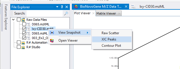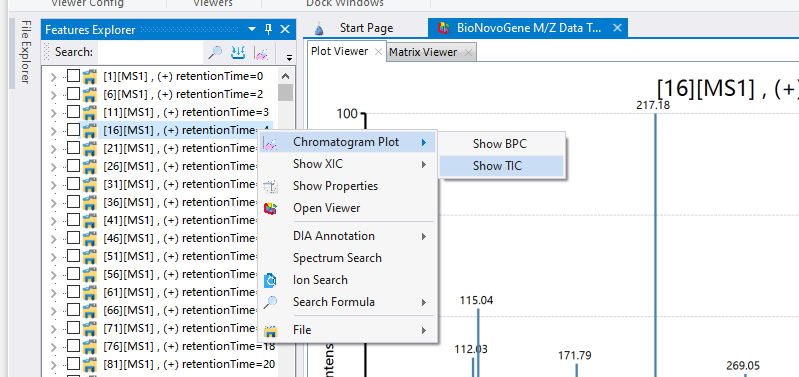 在mzkit软件之中查看色谱图非常的容易,我们只需要在原始数据文件上调用相应的上下文菜单的命令就好了。例如,如果我们需要绘制TIC或者BPC图,我们可以在【Feature Explorer】窗口中点击鼠标右键;然后点击TIC或者BPC就可以查看到相对应的色谱图了。