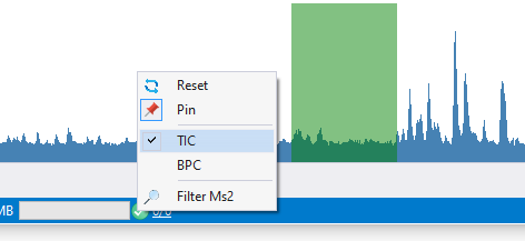- 【Pin】菜单可以让我们根据这个选项的状态,以两种不同的模式进行操作:当处于Pin状态被选中的时候,我们选择保留时间范围不会修改色谱图浏览器的当前时间范围;反之当Pin处于未选中的时候,每做一次保留时间范围的选择,都会更新浏览器当前的保留时间的选择范围。