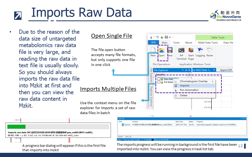 请注意,当mzkit的文件浏览器之中没有任何原始数据文件的时候,程序在打开文件的时候会直接在前台导入文件;当已经存在原始数据文件之后,为了不影响你在前台界面查看其他的原始数据文件,mzkit会在后台创建文件的导入任务。