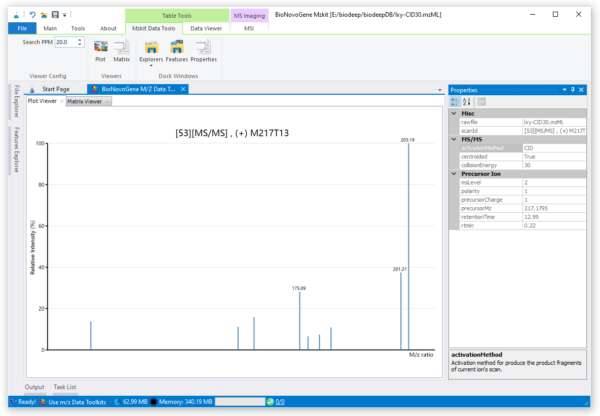 前面的色谱图或者散点图之类的,都是与保留时间相关的数据可视化。在这里的质谱图,就是离子碎片信息相关的数据可视化。色谱图是保留时间对响应度作图;而在这里的质谱图就是离子碎片信息对响应度的作图结果。在mzkit软件之中查看质谱图是非常容易的,只需要在【Features Explorer】之中点击相应的Feature就可以看到对应的质谱图信息了。