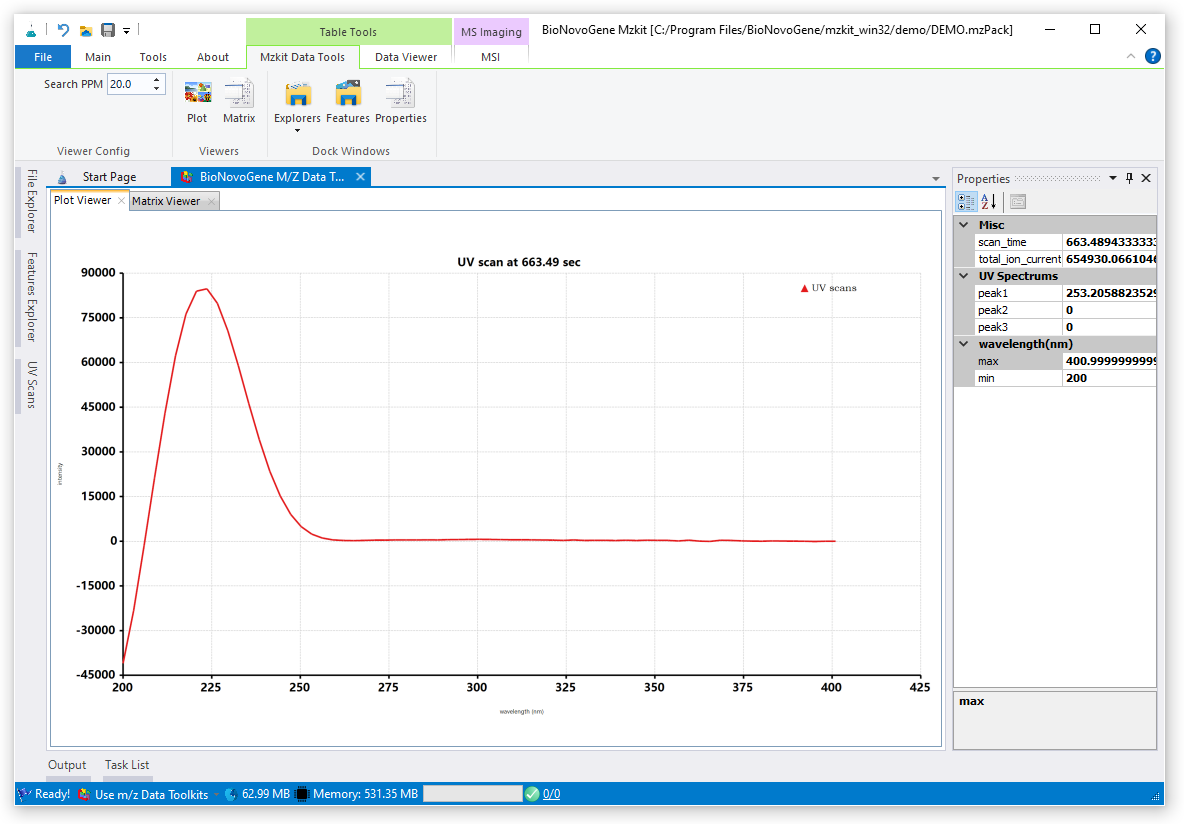 可以看见,紫外吸收光谱就是紫外光的波长和物质对紫外光吸收的程度做出来的曲线图。在mzkit软件之中,每一次加载紫外吸收光谱数据,都会自动做峰查找,自动查找出最大吸收量的波峰。例如,从右边的属性显示窗口界面之中,我们可以看到,当前时间的最大紫外吸收波长为253纳米。