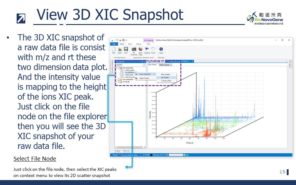 • 【三维峰图】三维峰图所表达的含义与散点图是一致的,只不过散点图是二维的可视化结果,intensity值使用颜色来代替。而在三维峰图之中,intensity则是变成了峰高。