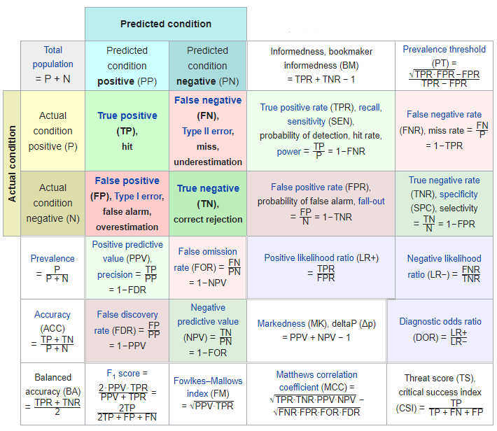对于一个二元分类问题,我们只能够预测目标为目标分类或者不是目标分类,所以我们可以根据分类结果得到一个表格: