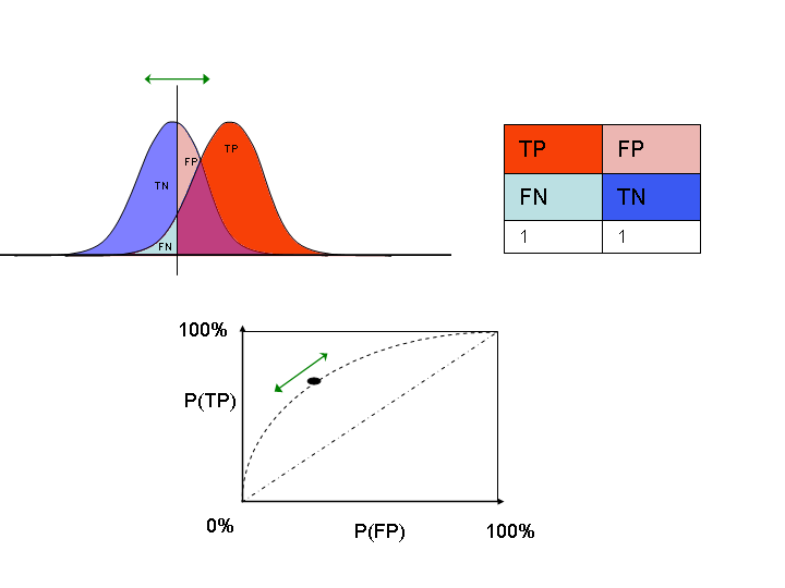 根据上面的描述和示意图中,我们也可以看得到:由于算法的缺陷,阳性结果可能会和阴性结果存在一部分的重叠。当我们将分类的阈值垂直线向左右移动的时候,可以得到不同的阈值。这样子,在不同的阈值下,假阳性率与假阴性率也在发生不同的变化。所以我们可以看得出来,ROC曲线的绘制就是选择阈值与计算当前阈值下假阳性率与真阳性率变化的过程。