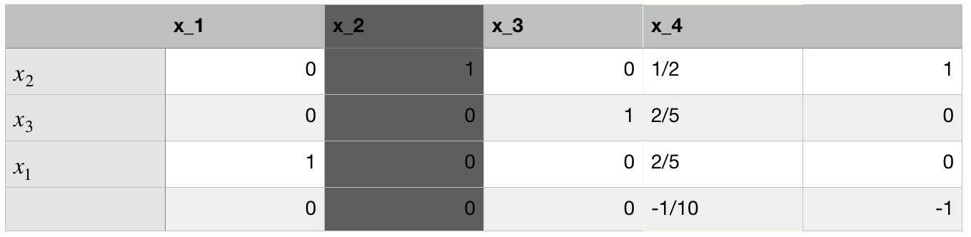 - 数学原理:为了使新的基变量 x_k 在其所在的行(第 i 行)的系数变为1,我们将整个第 i 行的方程两边同时除以主元 a_ik。