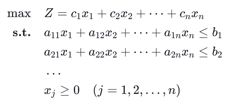 单纯形法是1947年美国数学家丹捷格(G.B.Dantzig)提出的一种用于一般线性规划问题求解的方法。这种方法其主要的核心思想为从可行域的一个顶点出发,迭代到相邻更优顶点,直到最优。这种LP问题求解计算方法会比较适合于中小规模、精确解需求高的线性规划问题。单纯形法首先要做的就是把方程化为标准形式: