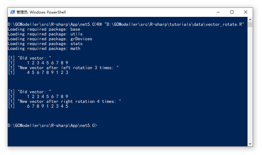 将上面在VB.NET框架底层代码中所实现的向量左旋以及右旋的代码同时也开放给了R#脚本环境中,使用起来的实际效果是和rust代码中差不多的: