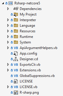 : contains the R# language interpreter source code, all of the expression class model definition.Interpreter: contains the necessary code for parse the language tokens from the input script text and the syntax parser for create the corresponding R# expression object based on the language token sequence and the language context.Language: contains the necessary code for imports the external .NET function and the runtime environment definition for run the R# expression evaluation. this folder also contains some primitive R# function for manipulate your dataset, example as lapply, sapply, list, which, etc.Runtime: contains the code for the runtime configuration and the third part package loader and tools for build your own R# package.System