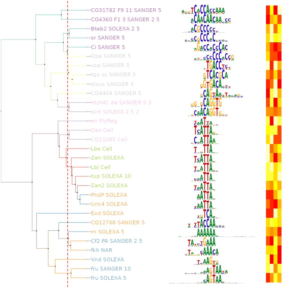 通过二叉树聚类操作之后,每一个二叉树结点都是一个相似度非常高的种子的集合。那我们的Motif的PWM(Position Weighted Matrix)矩阵就是基于这些高度保守的种子所产生的。由于这些种子保留片段之间的长度可能会不一样,所以在这里我们会首先需要对这些同一个二叉树节点中的种子片段做一次多序列比对。通过多序列比对之后,我们就可以将序列片段都变成等长片段了。基于这些等长片段,我们就可以非常容易的建立碱基的位置概率分布矩阵,即PWM矩阵。