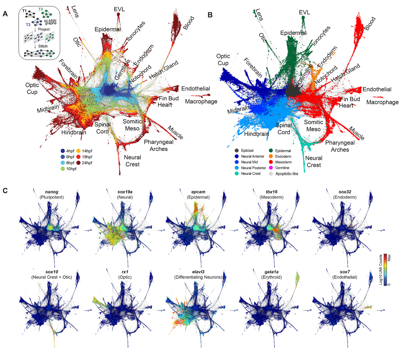 Fig. 2. Single-cell graph reveals a continuous developmental landscape of cell states. (A) Overview of graph construction strategy, and a force-directed layout of the resulting single-cell graph (nodes colored by collection timepoint). For each cell, up to 20 within- or between-timepoint mutual nearest neighbor edges are retained. (B) Single-cell graph, colored by germ layer identities inferred from differentially expressed marker genes (see table S2). (C) Single-cell graphs, colored by log10 expression counts for indicated cell type-specific marker genes.