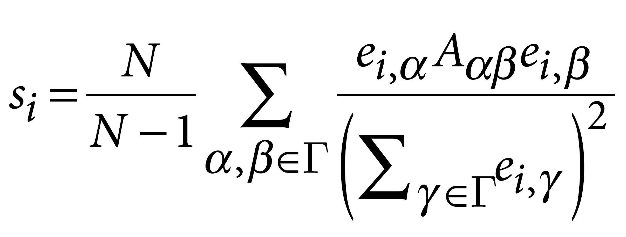 where ei,α represents the average expression of gene i in node α of the topological representation, normalized as described in the paragraph “Processing of single cell RNA-seq data”. Γ denotes the set of nodes of the topological representation, Aα,β is its adjacency matrix, and N is the total number of nodes. With this normalization, si takes values between 0 and 1.
