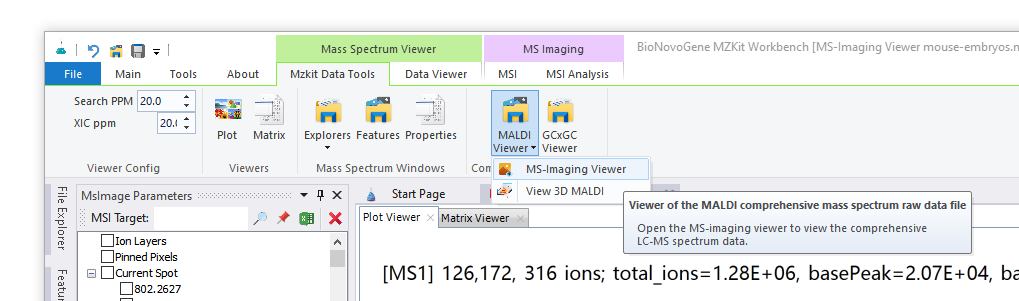 首先来给大家介绍一下MZKit软件:MZKit工作站软件是一款代谢组学原始数据分析软件,其目前集成了LCMS/GCMS/MALDI以及靶向定量原始数据的数据分析功能,除了质谱数据分析和查看,在MZKit中目前还集成有化学信息学以及生物信息学相关的功能模块。通过这些功能模块,可以实现将质谱原始数据和具体的生物学知识进行关联。在今天我们所介绍的质谱成像数据文件查看模块,其就属于MZKit工作站的一个功能模块。如果想要访问质谱成像功能模块,我们可以通过软件主界面的【MALDI Viewer】菜单进入。