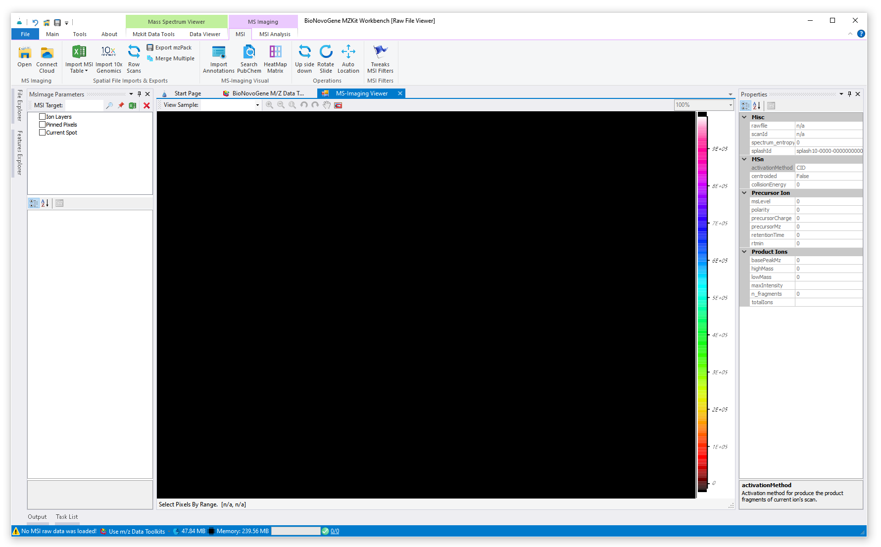 1. 软件中间占据很大一块面积的黑色区域就是质谱成像的显示区域了,后续质谱成像的显示都是在这个区域内展示的。在这个区域内同时又可以分为左右两部分:左边的黑色部分就是质谱成像显示的画布区域,右边则是成像热图的颜色条和具体的离子响应强度值