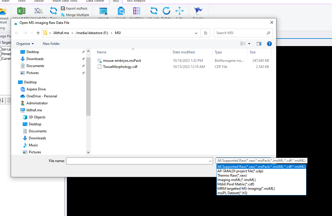 在这里我们主要介绍MZKit软件常用的几种空间代谢原始数据文件的打开操作。在MZKit工作站软件中打开原始数据文件是一件非常简单容易的事情,我们只需要在【MSI】菜单组之中,找到最左边的【Open】打开按钮,使用这个打开按钮就可以非常简单的进行空间代谢原始数据文件的打开操作了。现在我们点击这个菜单按钮,在弹出来的文件打开对话框中,可以看见目前在MZKit中支持有如下文件格式: