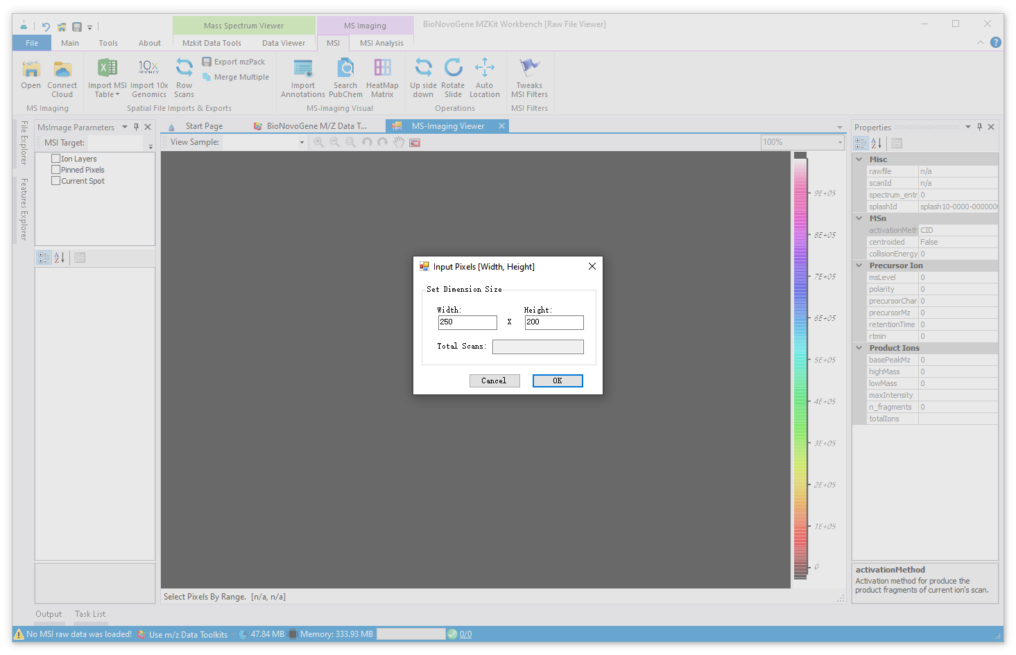 在这里我们根据实验室的上机人员所提供的扫描软件的参数信息,输入正确的宽度和高度信息,然后点击【OK】按钮就可以打开我们的原始数据文件进行质谱成像可视化了。
