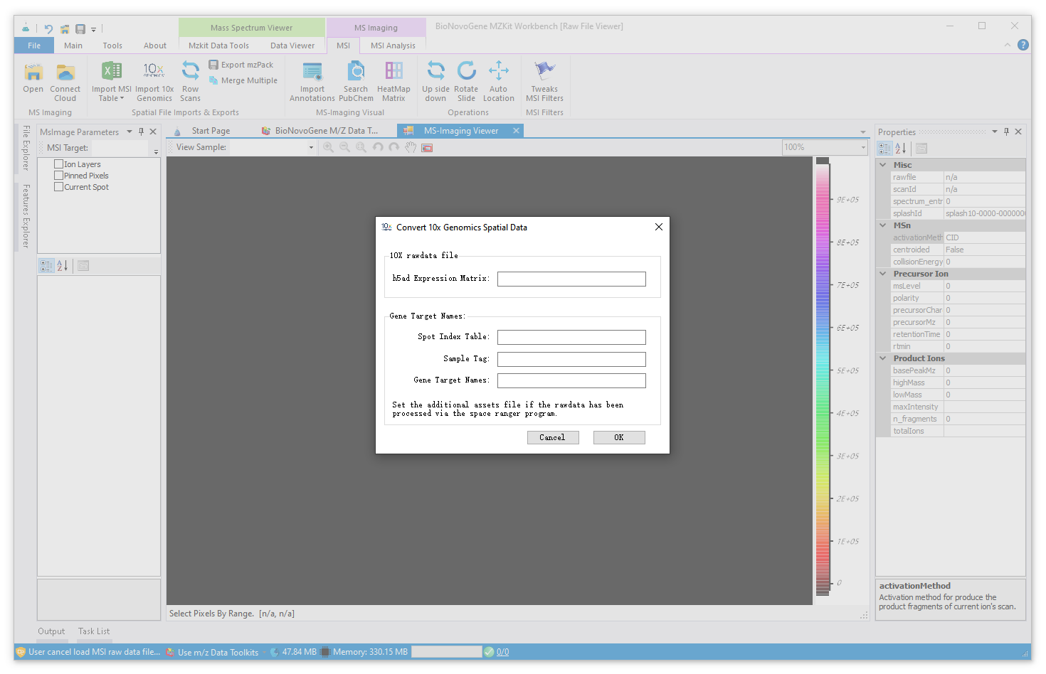 在MZKit软件之中,你还可以将10x genomics的空间转录原始数据进行导入,可视化生物样本上的基因的表达热图。具体的操作为:在【MSI】菜单栏中找到【Imports 10x Genomics】按钮,在弹出来的对话框中,一般会分为下面的两种情况进行相应的文件输入操作: