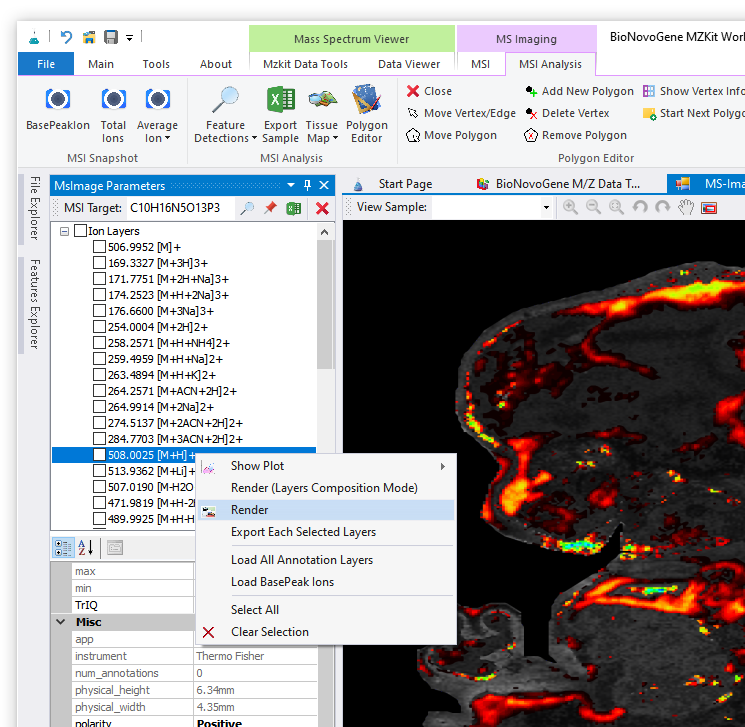 对于质谱成像可视化而言,其就是一个热图的绘制过程:我们将一定的离子图层信息提取出来,根据所提取的离子图层的信号响应度信息进行线性变换,映射到对应的颜色上,然后吧颜色显示到对应的空间坐标位置,就可以通过热图的方式吧我们的生物样本可视化出来了。在MZKit工作站软件之中,可以非常简单的进行单个离子的质谱成像,以及多个离子的质谱成像查看。