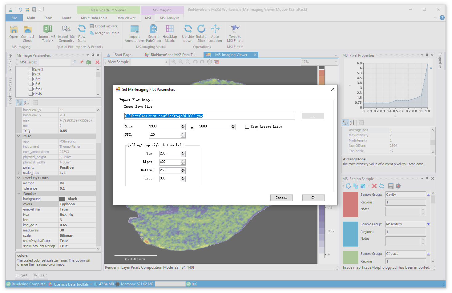 首先,我们在【MSImaging Parameter】窗口中找到【Render】参数调整区域,在这里面一般可以通过下面的参数来个性化调整成像图: