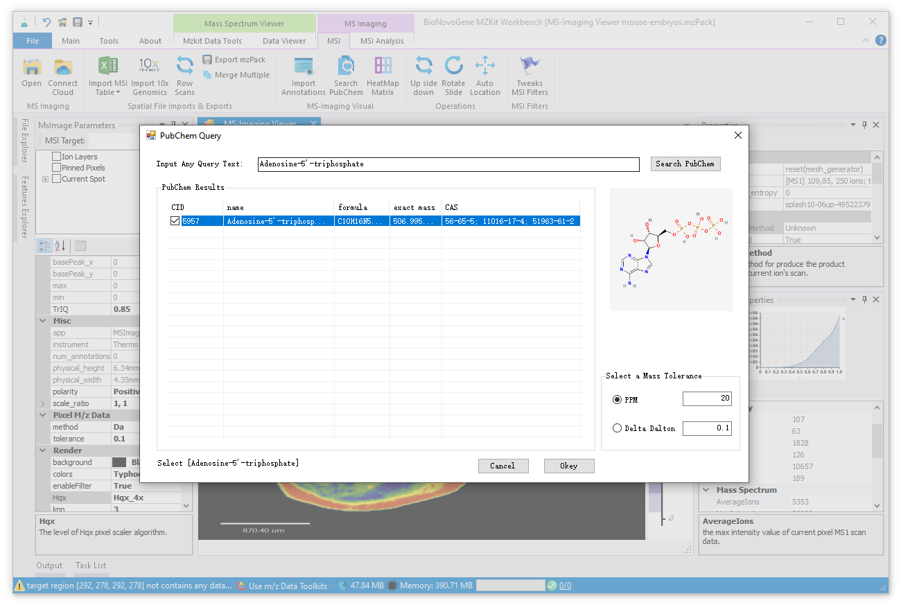 除了可以直接在【MsImaging Parameters】输入框中输入化学式进行mz值列表的计算,老师您还可以更加方便的使用MZKit集成的PubChem数据库查询功能进行成像离子列表的计算获取。具体的操作如下: