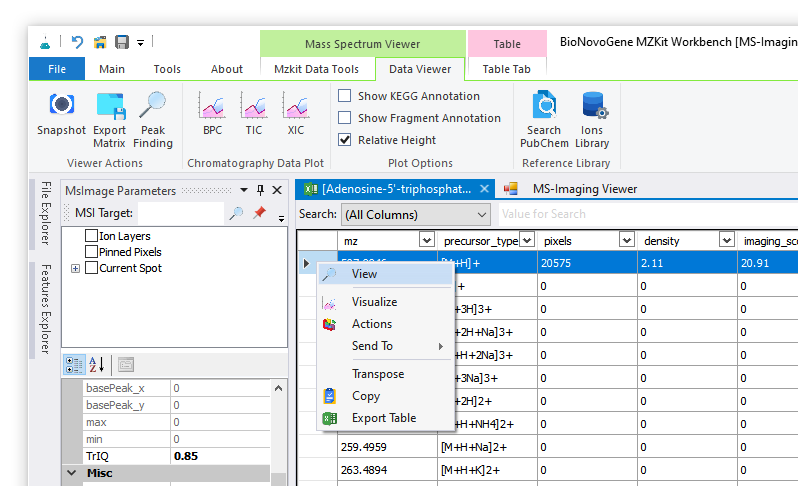 1. 最后我们可以通过表头选中某一个离子的行数据,通过右键快捷菜单的【View】操作查看目标离子mz的质谱成像图