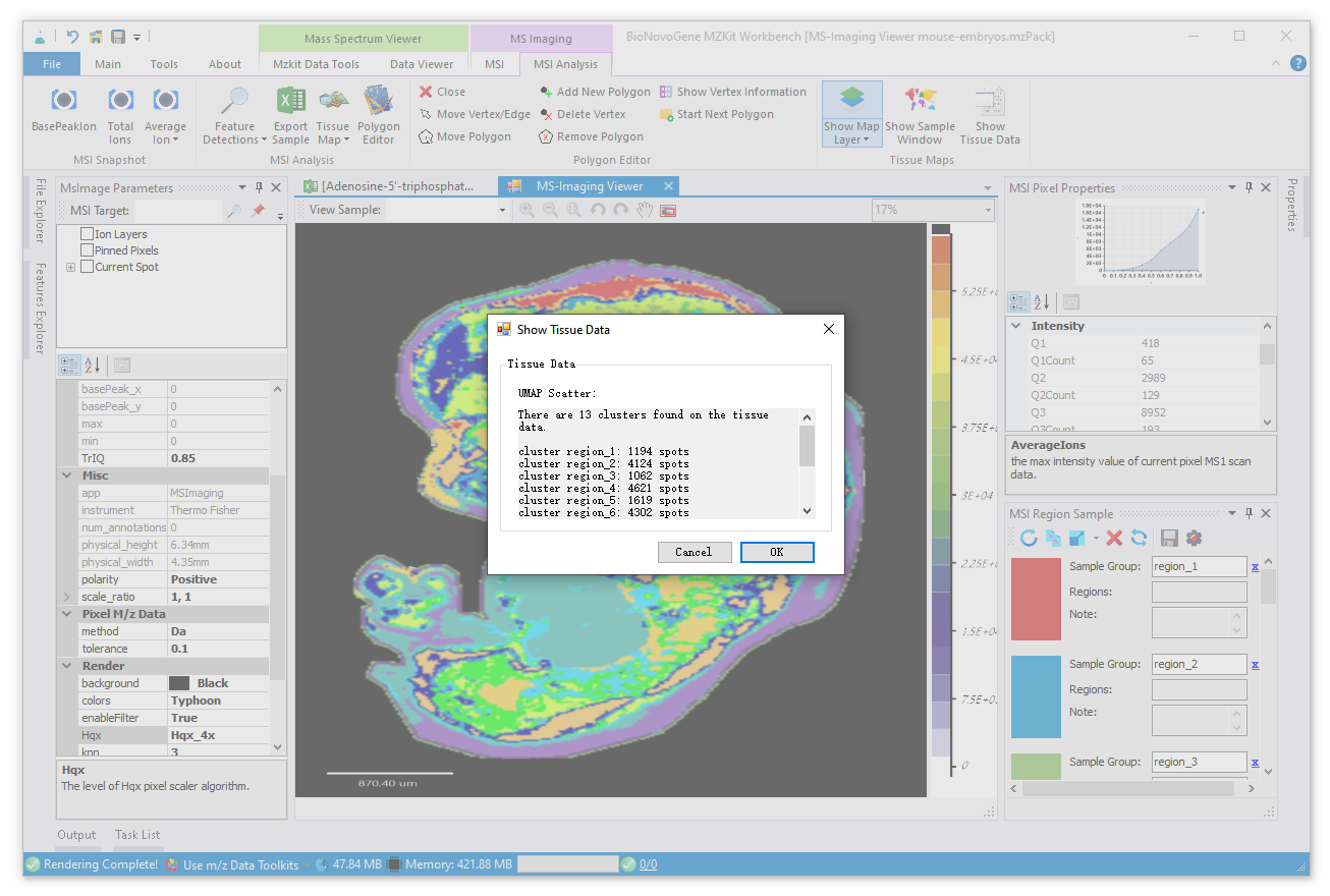 对于质谱成像可视化而言,其就是一个热图的绘制过程:我们将一定的离子图层信息提取出来,根据所提取的离子图层的信号响应度信息进行线性变换,映射到对应的颜色上,然后吧颜色显示到对应的空间坐标位置,就可以通过热图的方式吧我们的生物样本可视化出来了。在MZKit工作站软件之中,可以非常简单的进行单个离子的质谱成像,以及多个离子的质谱成像查看。