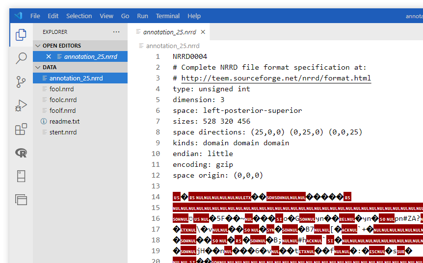 和一般的原始数据文件一样,在NRRD文件之中,分为文件头和数据区域两个部分。在NRRD文件之中,文件头是由ASCII编码的文本组成的,我们可以很容易的通过诸如vscode之类的代码编辑器打开NRRD文件,以文本的形式查看文件的文件头信息,例如: