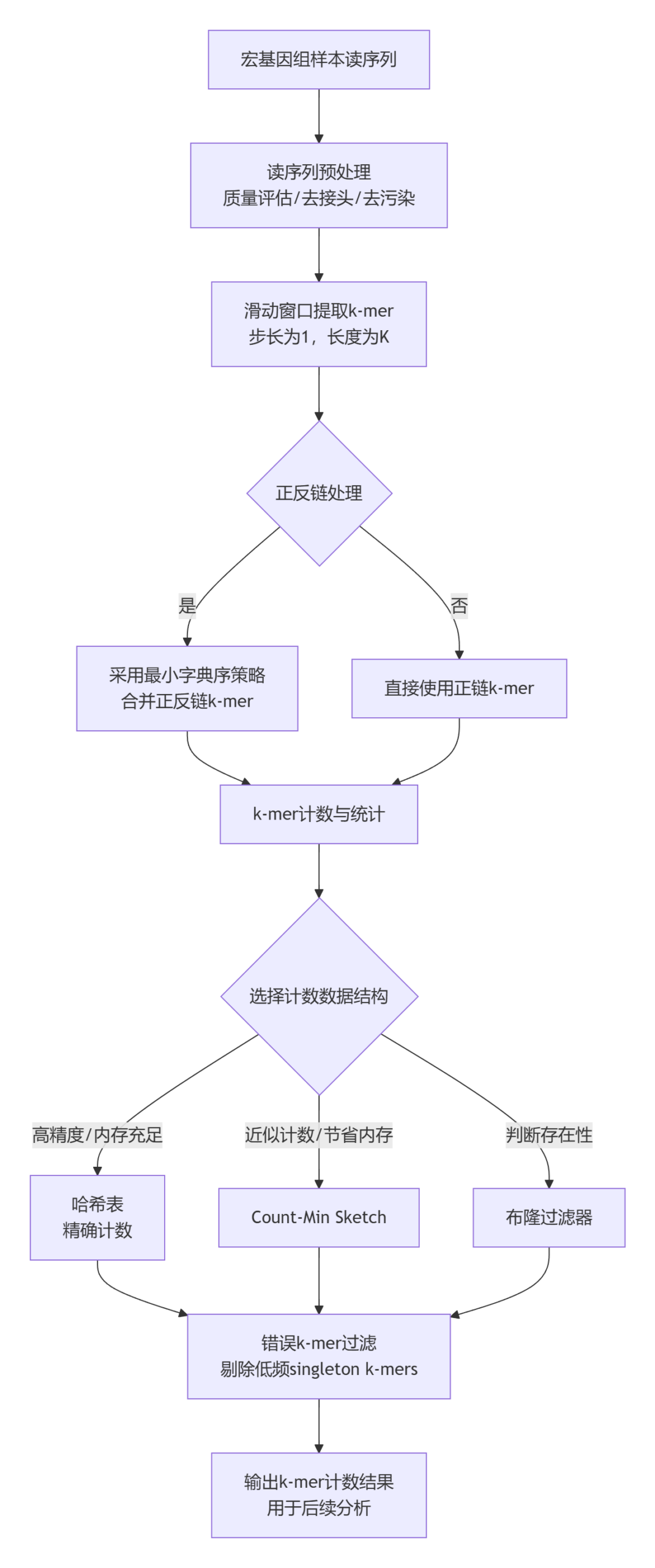首先,需要对宏基因组样本的读序列进行k-mer提取和计数。这一步的目的是获得样本中每个k-mer的出现频率。算法流程如下: