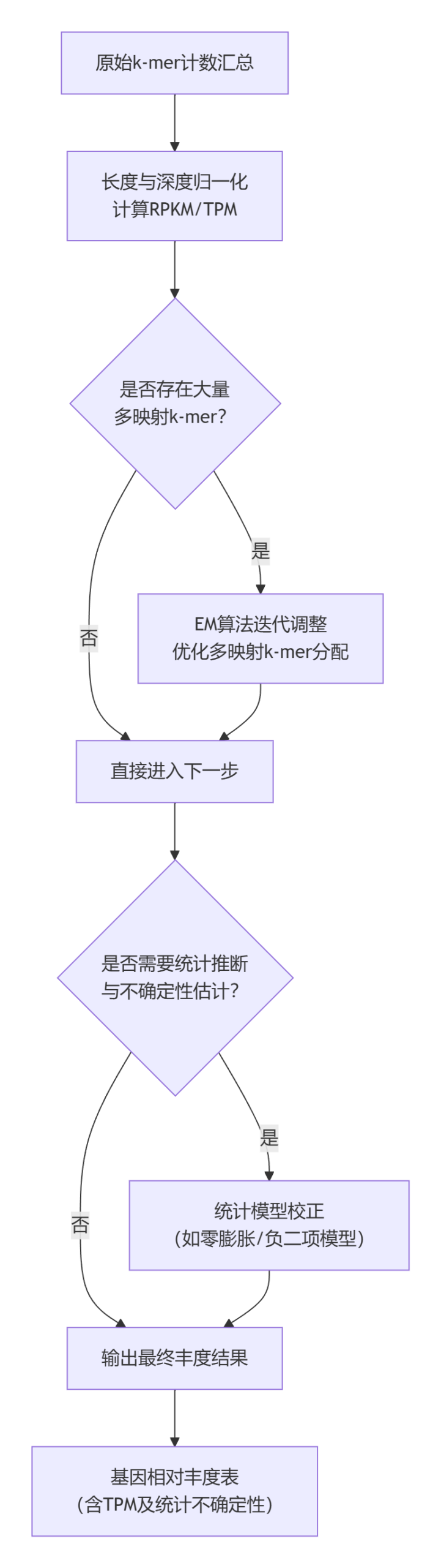 一个完整的工具并非孤立使用所有这些模型,而是将它们有机组合。综合以上因素,一个典型的基因丰度推断流程如下: