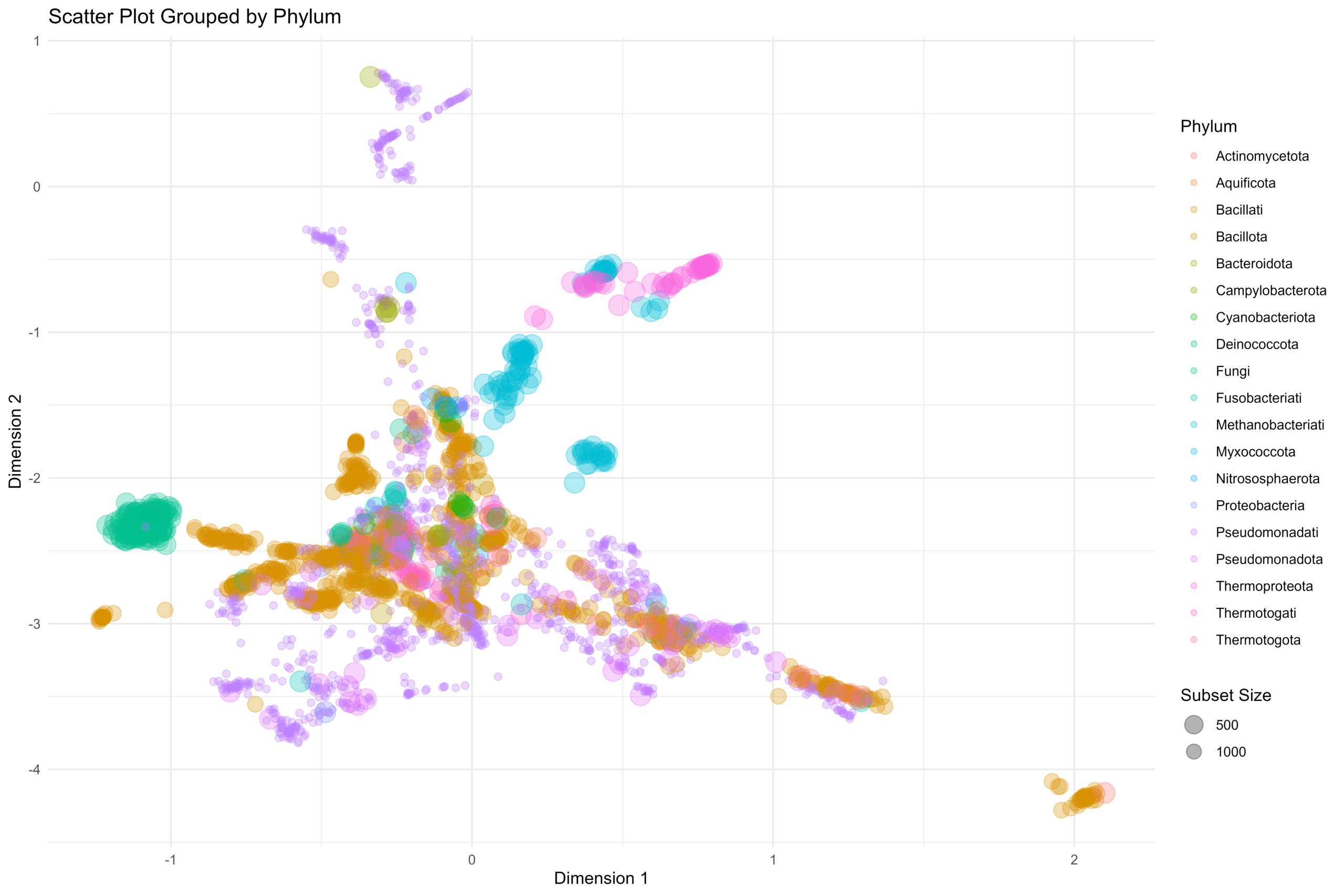 通过散点图可视化可以发现,在通过diamond软件来处理更加大型的数据集的blastp搜索注释下,我们得到的基因组的嵌入结果可以很好的对基因组进行物种分类工作。在我们所得到的基因组向量化嵌入结果的散点图上,相同颜色的散点(相同Phylum分类下的基因组)都是相互聚集在一起,说明我们的基于diamond搜索外加向量嵌入得到的基因组代谢功能注释向量化嵌入结果可以很好的提取出基因组的代谢特征。基于这些得到的特征向量结果值,我们可以很方便的用于下游的机器学习建模之类的工作